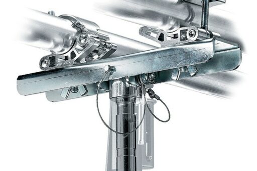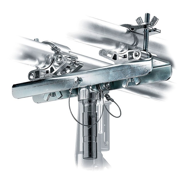 Zestaw dwóch klamer do montażu belek i kratownic estradowych na statywach. Klamry przykręcone są do ceownika, na którego środku zamontowany jest trzpień o średnicy 28mm.