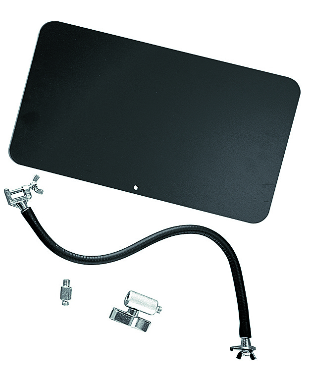 Avenger D340 to zestaw do modyfikacji oświetlenia sceny zawierający czarny plastikowy ekran-zastawkę o wymiarach 20cm x 35cm, elastyczne ramię, 2 małe klamry, adapter 3/8″ oraz adapter gniazda 3/8″. Można go wykorzystać do przesłaniania światła po zamocowaniu go na klamrze Super Clamp lub statywie oświetleniowym.