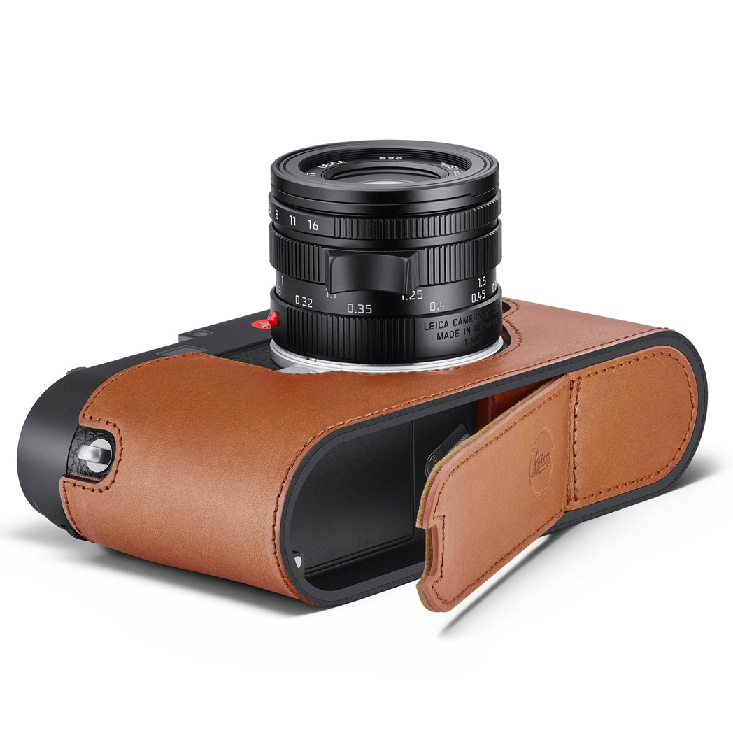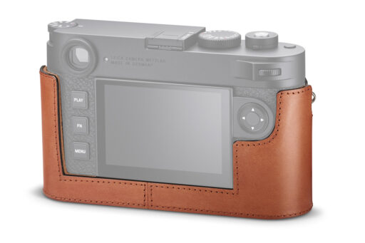 Pół pokrowiec wykonany z miękkiej, garbowanej roślinnej włoskiej skóry zapewnia optymalną ochronę Leica M11. Dostępny w trzech atrakcyjnych opcjach kolorystycznych (czarny, koniak i oliwkowa zieleń).