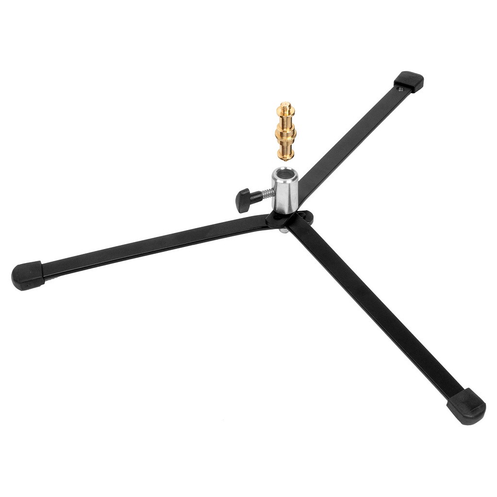 Niski statyw oświetleniowy 003B wyposażony w gniazdo 16 mm (5/8″) oraz adapter spigot do mocowania lamp lub innych akcesoriów. Statyw przeznaczony do oświetlenia tła i wszędzie tam, gdzie potrzebne jest ustawienie lamp na poziomie podłogi.