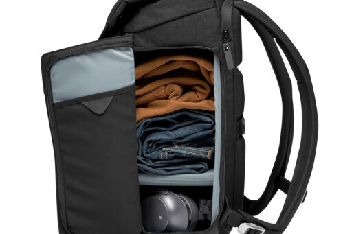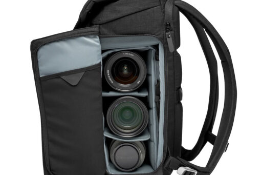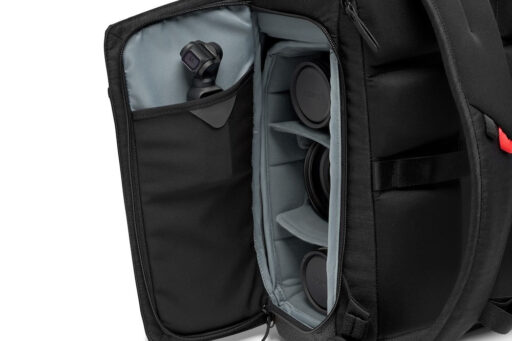 Plecak pomieści pełnoklatkowy aparat bezlusterkowy z dołączonym standardowym obiektywem zmiennoogniskowym oraz 2-3 dodatkowe obiektywy w zależności od wielkości. W specjalnej kieszeni na jednej z dwustronnych klap plecaka można również umieścić kieszonkowy gimbal DJI OSMO Pocket. Górna komora jest w pełni zarezerwowana dla rzeczy osobistych. Z tyłu plecaka znajduje się oddzielona od głównej komory przegroda na laptopa, która pomieści urządzenia o przekątnej 14 cali.
