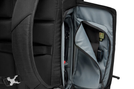 Dla zapewnienia spokoju i bezpieczeństwa plecak posiada system ochrony Manfrotto Slim-Tech Protection, który gwarantuje ochronę sprzętu przed wstrząsami. Uchwyt statywu z przodu plecaka pozwala na posiadanie zawsze przy sobie statywu podróżnego, przymocowanego w jednej z 3 różnych konfiguracji w zależności od potrzeb i wielkości statywu.