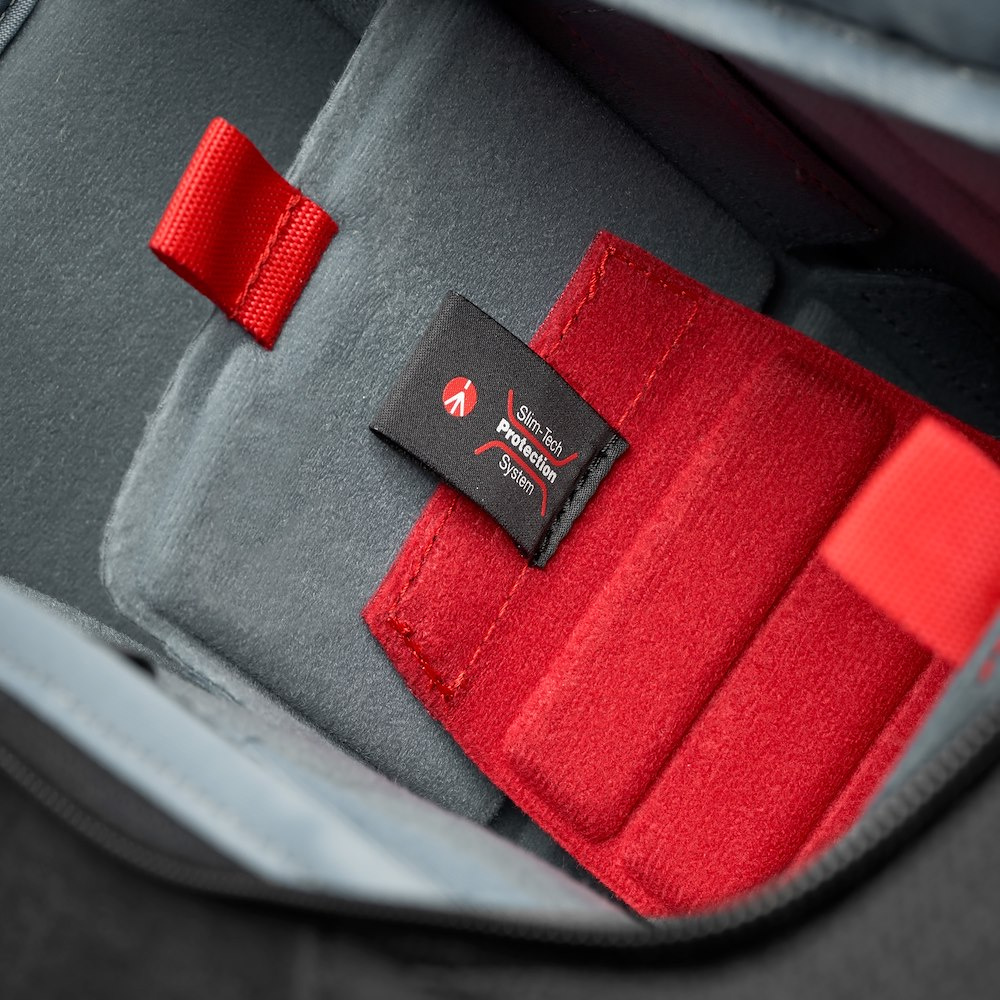 Dla zapewnienia spokoju i bezpieczeństwa plecak posiada system ochrony Manfrotto Slim-Tech Protection, który gwarantuje ochronę sprzętu przed wstrząsami. Uchwyt statywu z przodu plecaka pozwala na posiadanie zawsze przy sobie statywu podróżnego, przymocowanego w jednej z 3 różnych konfiguracji w zależności od potrzeb i wielkości statywu.