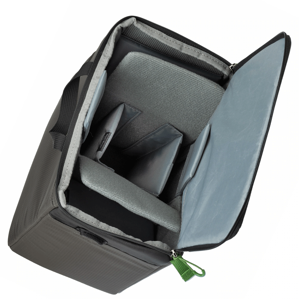 Wewnątrz torby organizację i zabezpieczenie sprzętu zapewniają regulowane przegródki mocowane na rzepy. System pozwala na aranżacje przestrzeni dla aparatu z teleobiektywem typu 70-200. Zabranie dodatkowe od dwóch do pięciu obiektywów, lampę i niezbędne akcesoria.