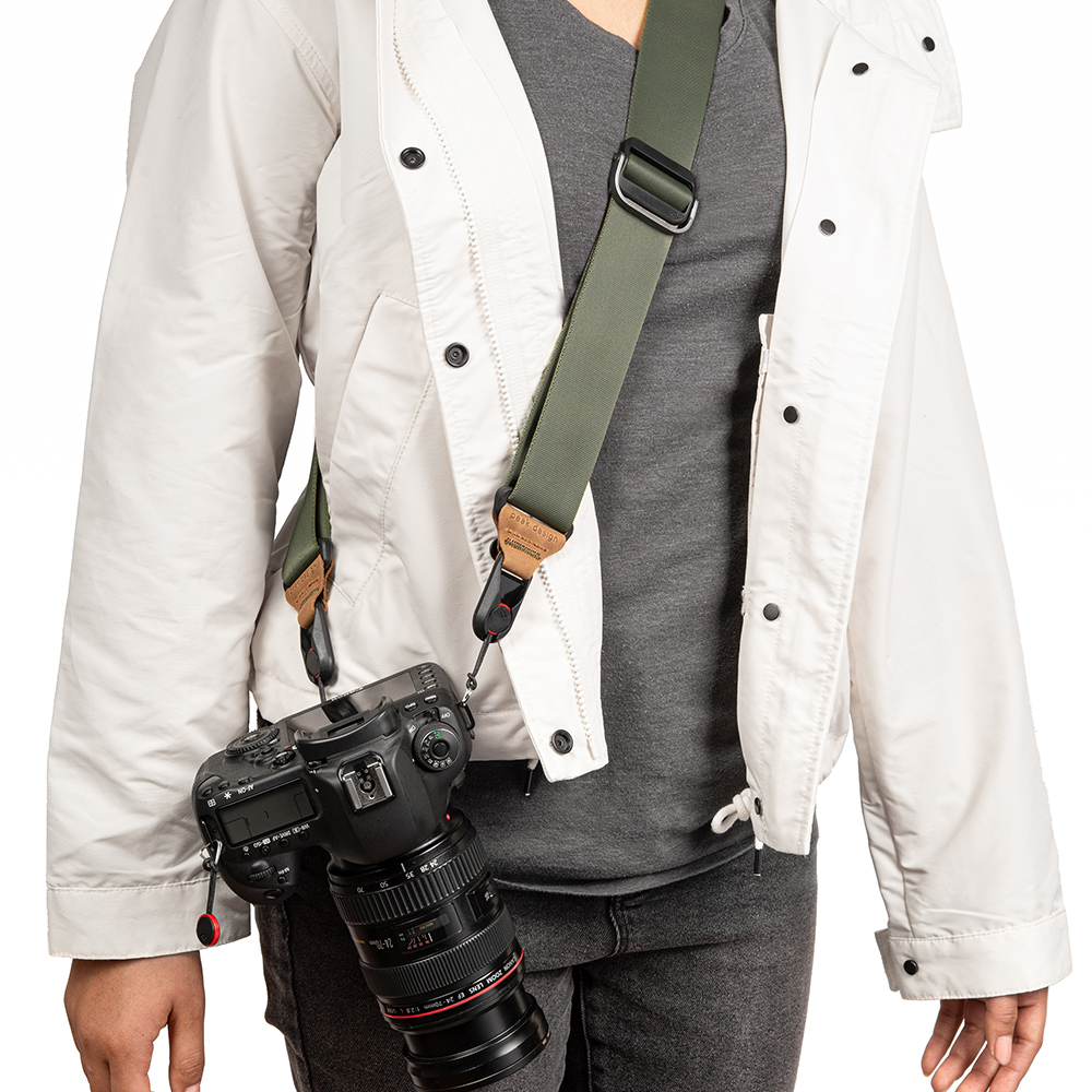 Szeroki pasek do noszenia aparatu na szyi lub ramieniu. Udźwig 90 kg i innowacyjny system regulacji długości zapewnia komfort i bezpieczeństwo sprzętu. System kotwic kompatybilny z innymi produktami Peak Design.