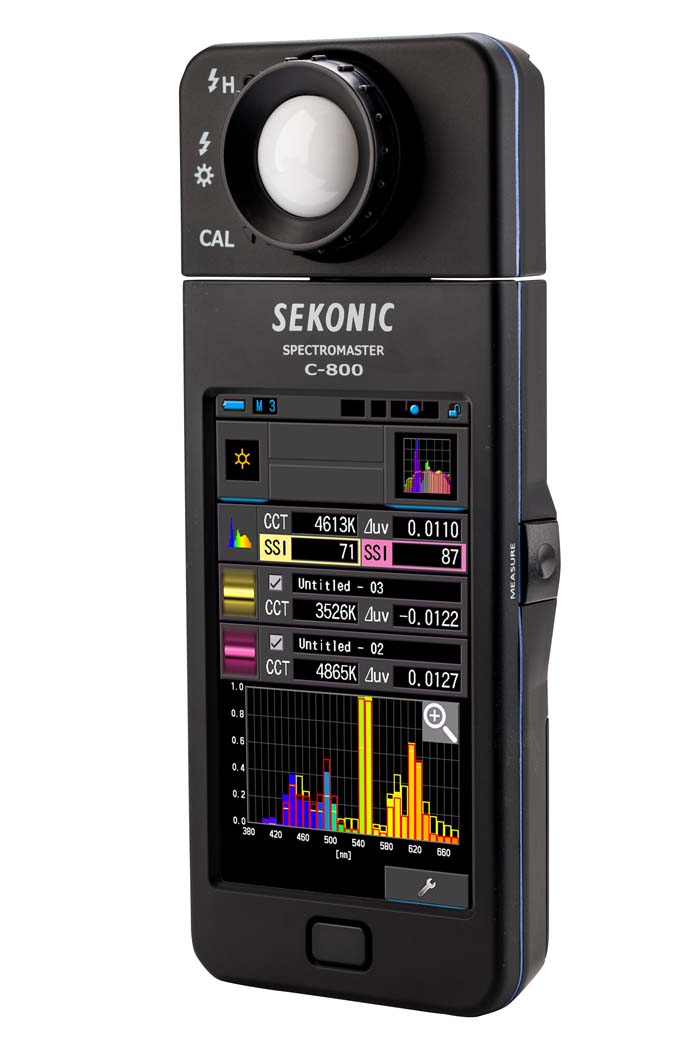 Sekonic SpectroMaster C-800 to precyzyjny miernik barwy dla każdego rodzaju źródła światła, w tym LED, HMI, Fluorescencyjne oraz lamp błyskowych. Jego system pomiarowy o wysokiej rozdzielczości z matrycą CMOS umożliwia rejestrowanie skoków mocy wyjściowej źródła światła w celu zapewnienia wysokiej dokładności pomiaru koloru. W odróżnieniu do inny modeli spektrometrów, C-800 wyświetla parametry głównych źródeł światła i filtrów do obiektywów prezentowane są na dedykowanych, oddzielnych widokach ekranu, co upraszcza korygowanie i modyfikowanie światła w celu uzyskania idealnej barwy oraz szybszego przetwarzania danych po pomiarze.