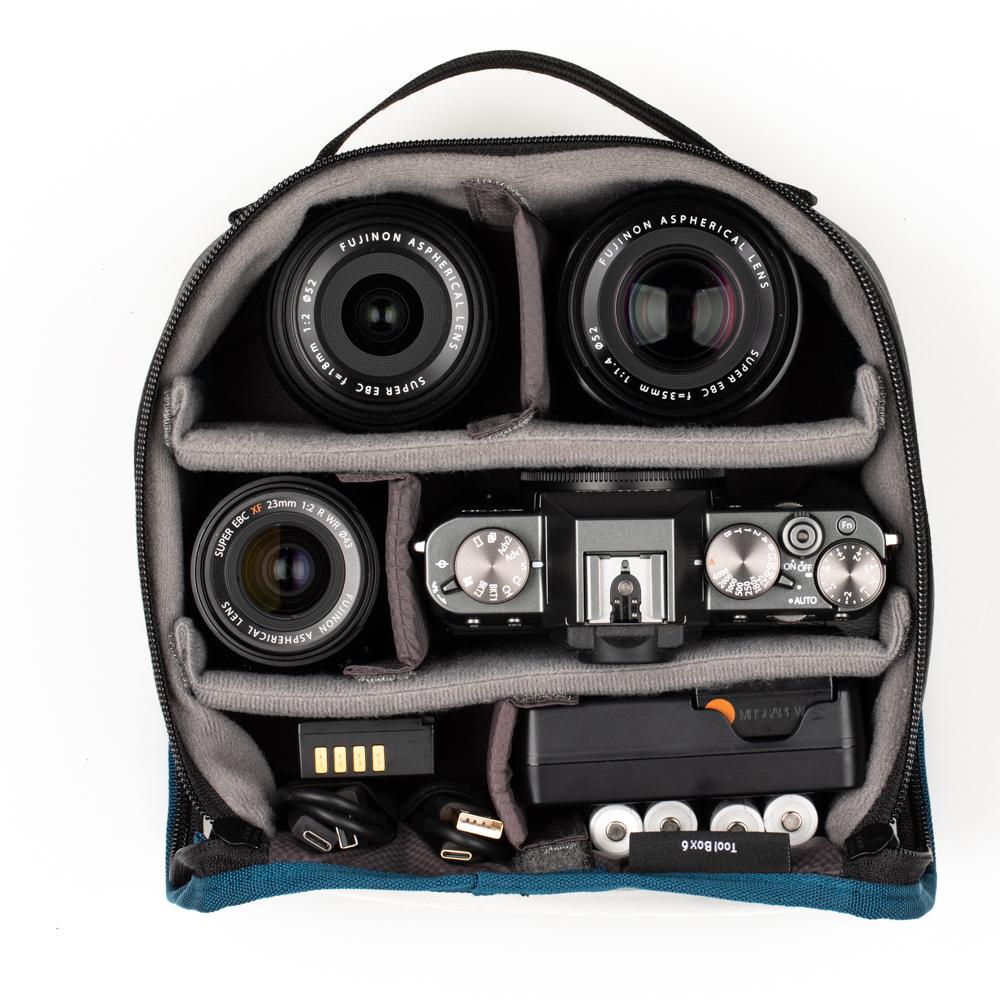 Pojemność: kamery GoPro®/Action, aparaty bezlusterkowe, obiektywy, lampy błyskowe, mikrofony, sprzęt audio, baterie, kable i akcesoria