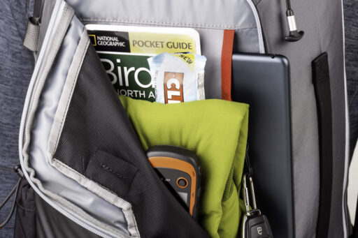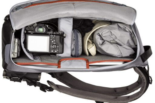 Photocross 13 jest obracany do przodu, gdzie znajduje się przedni panel plecaka z dogodną przestrzenią dla książek, notatników, przekąsek lub odzieży. Dodatkowo kieszeń do smartfona lub na tablet do 10″.
