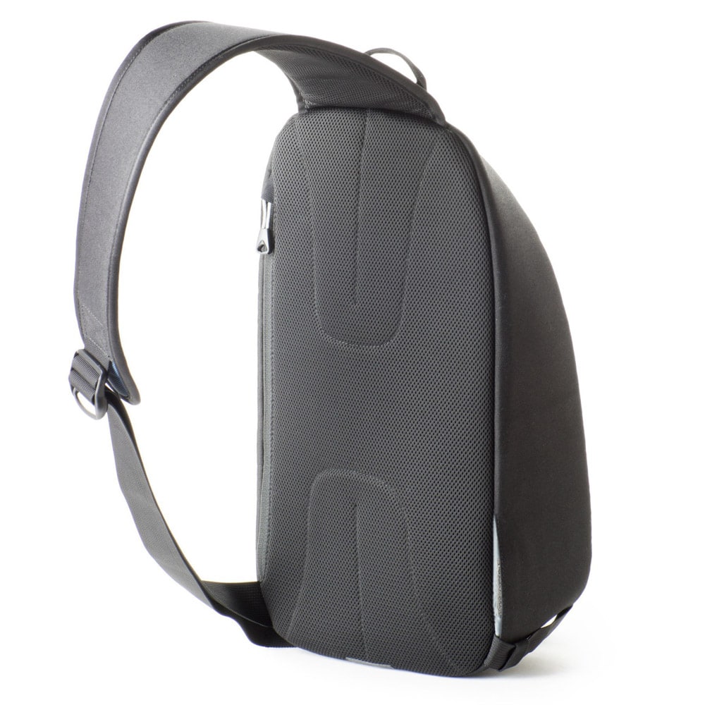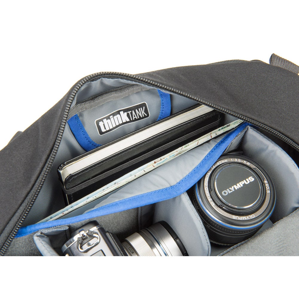 Lekka torba na aparat TurnStyle 10V2.0 Sling firmy Think Tank Photo jest wodoodporna i mieści lustrzankę cyfrową z trzema obiektywami i akcesoriami wewnątrz przegródek w głównej komorze zapinanej na zamek. Mieści również 8-calowy tablet w dedykowanej wyściełanej zewnętrznej kieszeni zapinanej na zamek błyskawiczny z tyłu torby. Do przechowywania akcesoriów w nosidle znajdują się różne kieszenie.