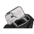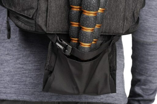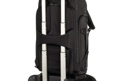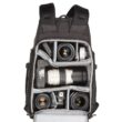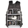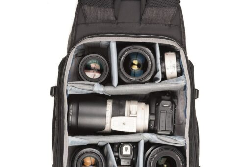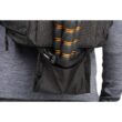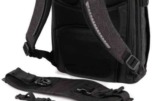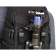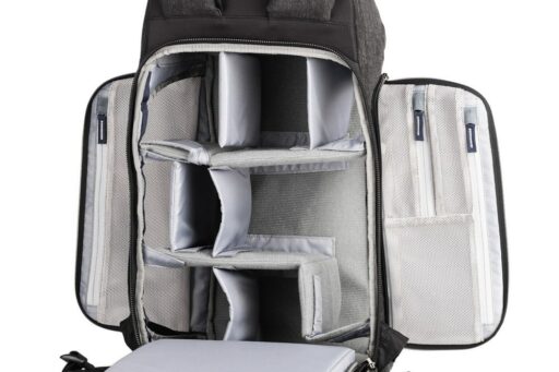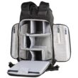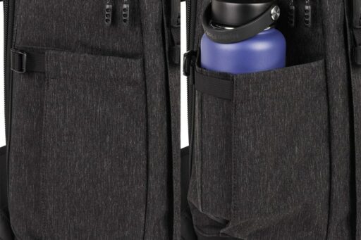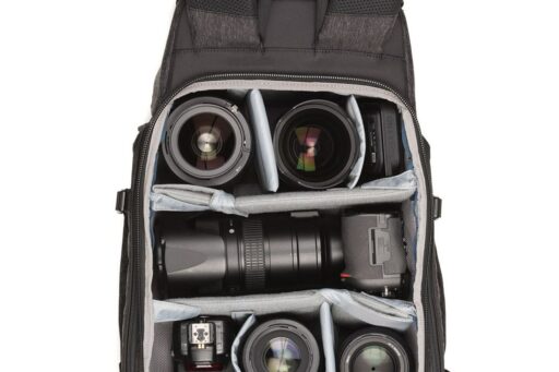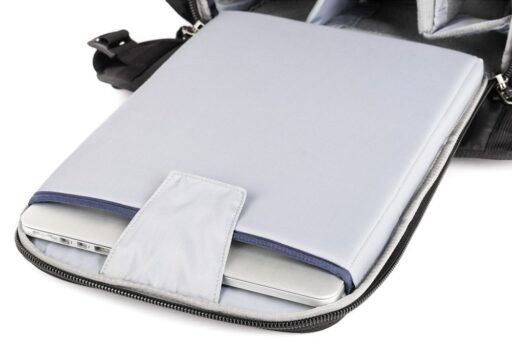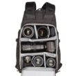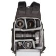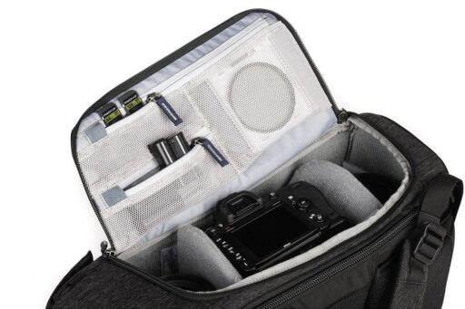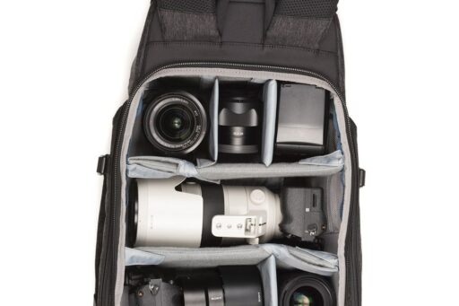 Pełny dostęp do komory głównej i jej siedmiu wyjmowanych przegródek zapewnia panel z zamkiem błyskawicznym skierowany do tyłu, który otwiera się o 180° w dół, odsłaniając także 15-calowy pokrowiec na laptopa z zakładką przytrzymującą. Zapinany na zamek panel umożliwia również umieszczenie przedmiotów wzdłuż lewej strony użytkownika. Wewnątrz tego panelu znajdują się trzy zapinane na zamek kieszenie organizacyjne z siatki, które można wykorzystać do przechowywania i organizowania baterii do aparatu, kart pamięci lub małej elektroniki. Dodatkowy zapinany na zamek panel po prawej stronie użytkownika otwiera się, odsłaniając jedną dużą zapinaną na zamek, siateczkową kieszeń, podczas gdy wzdłuż zewnętrznej strony każdego zapinanego na zamek panelu bocznego znajduje się duża, otwarta kieszeń, która może pomieścić butelkę z wodą o pojemności 1 l. Aby zabezpieczyć każdy przedmiot umieszczony w środku, pasy są zintegrowane z krawędzią każdej kieszeni.